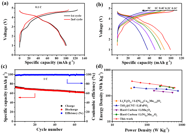 圖3. (a) LiNbGeO5@C II LiNi0.5Mn1.5O4 全電池的前兩圈充放電曲線;(b) 全電池倍率性能;(c) 電流密度為1C時,全電池的循環穩定性;(d) 與先前報道的鋰離子全電池的能量/功率密度比較。