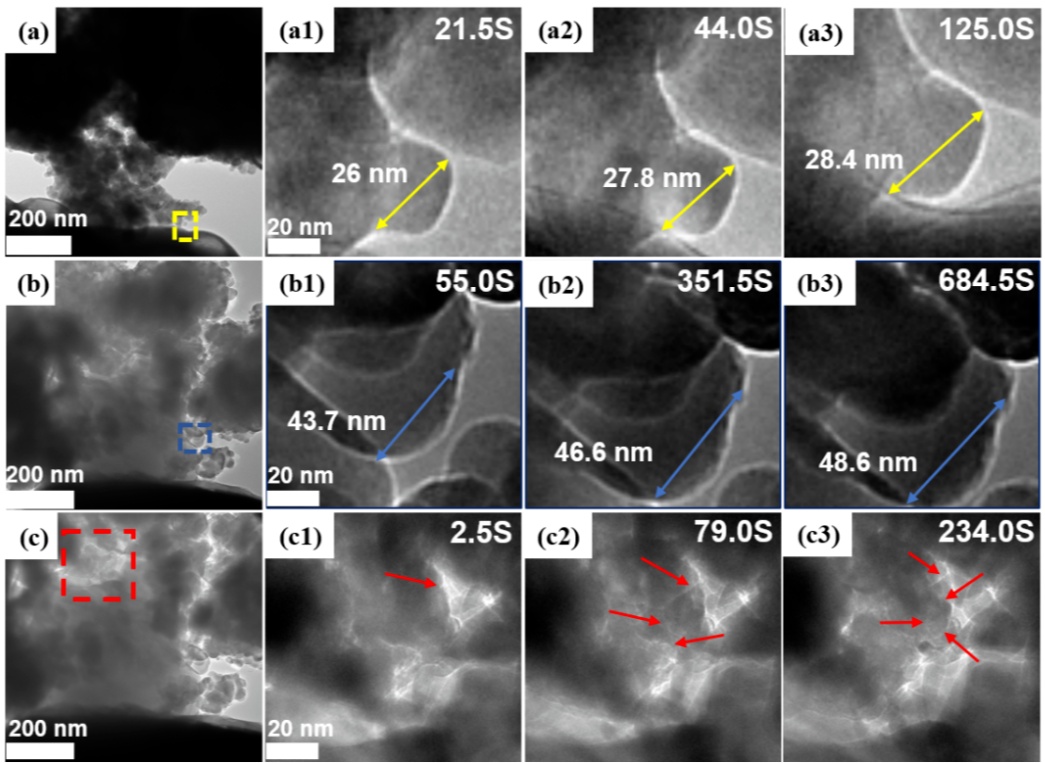 圖5. (a) 觀測中的單個LiNbGeO5@C顆粒;(a1-a3) 圖5a中顆粒在鋰化過程中的動態體積變化;(b) 觀測中的另一個LiNbGeO5@C顆粒;(b1-b3) 圖5b中顆粒在鋰化過程中的動態體積變化;(c)觀測中的LiNbGeO5@C顆粒;(c1-c3) 圖5c中顆粒的動態形貌變化。