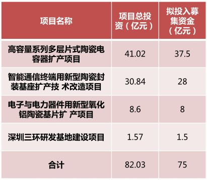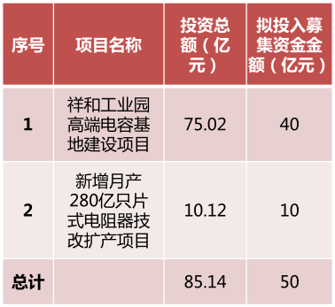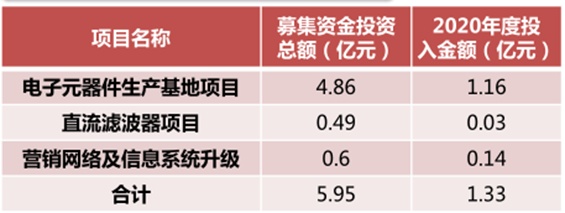 項目1,擬在肇慶市端州區祥和工業園地塊及其附屬建筑物建設高端片式多層陶瓷電容器產業新基地。項目建成后,于2024年達產時實現高端MLCC新增月產能規模約450億只(新增年產能規模約5,400億只)。2020年末,按合同簽訂金額已完成投資29.88億元;投資10億元的新增月產280億只電阻技改擴產項目于2020年12月完成立項,目前正在加速推進。