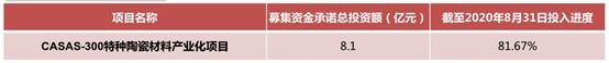 公司近年來積極探索新材料領域,掌握了CASAS-300特種陶瓷材料的核心技術,擬投資8.1億元用于支持CASAS-300特種陶瓷材料產業化項目,截至2020年8月31日該項目投入進度已達81.67%。