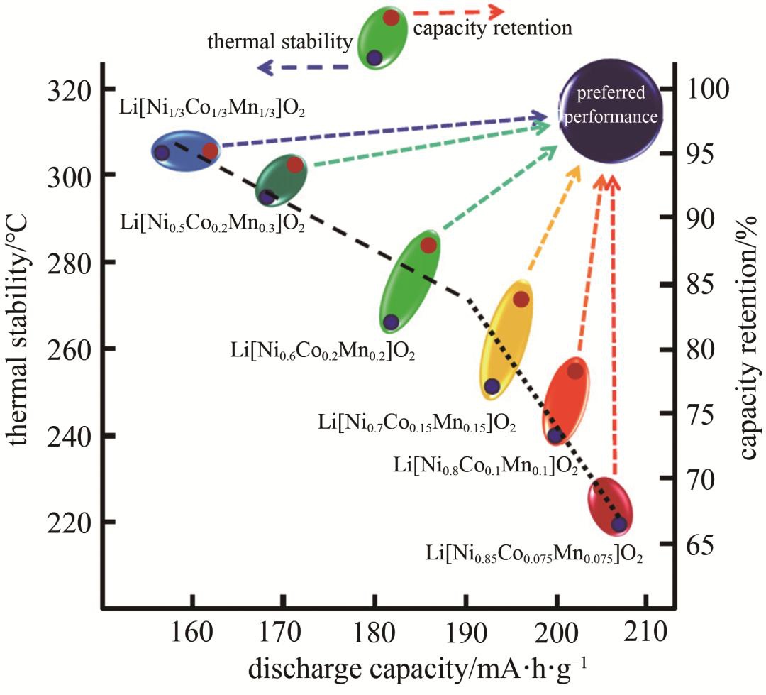 ▲不同Ni含量NCM的放電比容量、熱穩定性和容量保持率關系圖