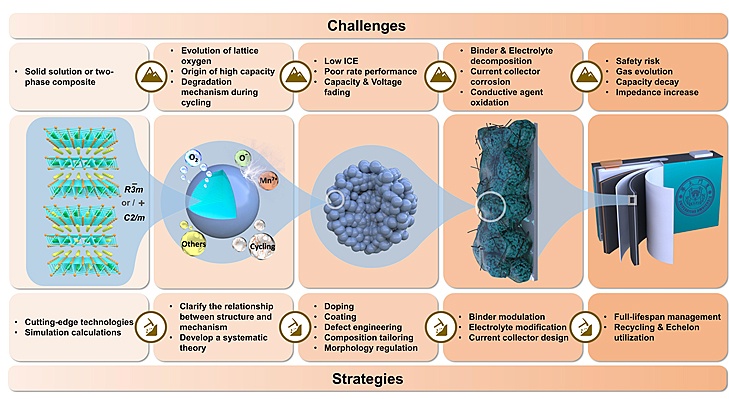▲富鋰錳基正極材料從晶體結構到實際應用各個階段面臨的挑戰和策略概述。