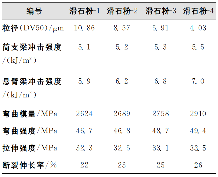 谷博等采用不同粒徑的滑石粉填充聚丙烯,通過對復合材料力學性能和加工性能的測試,研究了滑石粉粒徑對復合材料性能的影響。