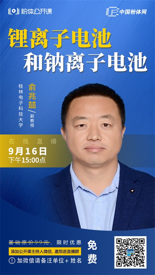 為深入了解鋰/鈉電池的異同及目前鋰電行業的發展狀況,中國粉體網旗下粉體公開課平臺將于2021年9月16日下午15:00舉辦網絡直播,屆時來自桂林電子科技大學的俞兆喆副教授將作《鋰離子電池和鈉離子電池》報告,匯報人將著重對鋰/鈉離子電池的結構、原理及其關鍵材料的異同進行對比分析,介紹鋰/鈉離子電池用正負極材料的現狀及發展趨勢。并從目前鋰電行業的發展狀況出發,對企業技術、專利狀況以及未來鋰電發展方向做了預判。通過分析國家相關政策和鋰電池市場的發展,對鋰電池的未來發展進行了展望。