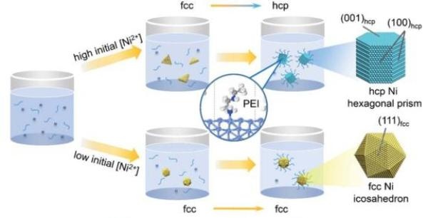 研究剖析了hcp晶相鎳納米晶生長過程中獨特的晶相轉變(fcc→hcp)過程。實驗結果與理論計算表明,hcp晶相的形成及其形貌演化過程主要源于表面活性劑聚乙烯亞胺(PEI)對hcp晶相不同晶面的選擇性吸附。該工作為不同晶相結構鎳納米材料的可控制備提供了新思路,相關成果發表在Journal of Materials Chemistry A上。
