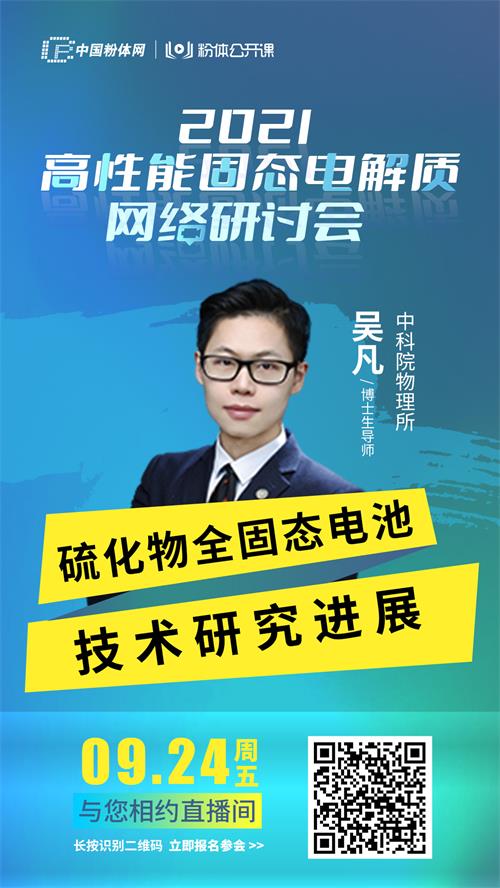 實現高比能硫化物全固態電池的實際生產與應用,硫化物固態電池仍面臨許多問題需要克服。鑒于此,中國粉體網旗下粉體公開課平臺將于2021年9月24日舉辦“2021高性能固態電解質網絡研討會”,屆時來自中科院物理所的吳凡研究員將作《硫化物全固態電池技術研究進展》報告,此次報告將重點關注硫化物全固態電池的關鍵基礎科學問題和應用化開發難題,探討其團隊在此領域的研發進展。