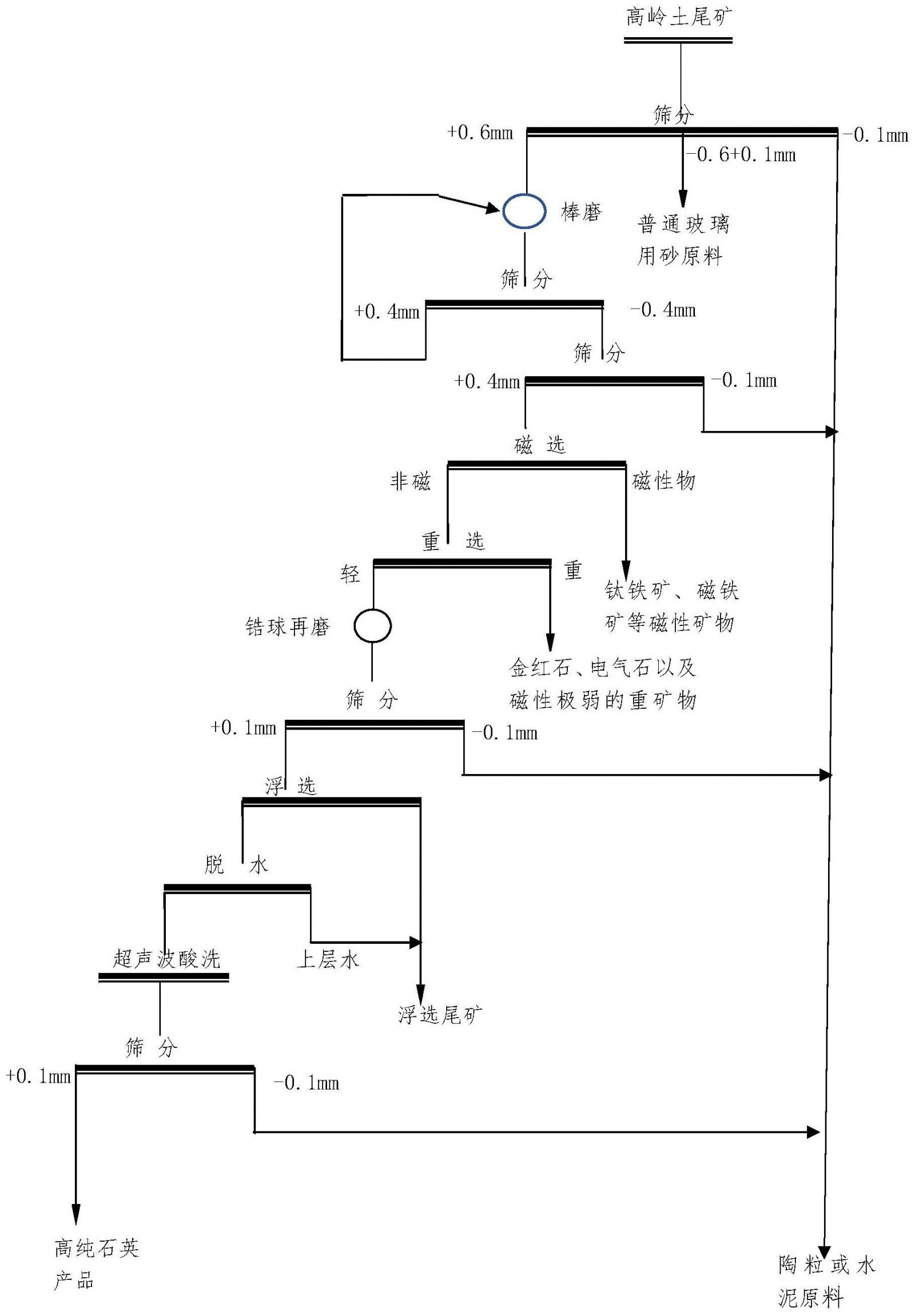 本發(fā)明方法不但可獲得高質(zhì)量的石英精礦產(chǎn)品,而且加工時間較短,工藝流程簡單,能耗低,并且獲得的石英精礦品質(zhì)較高,可達到高純石英質(zhì)量要求。