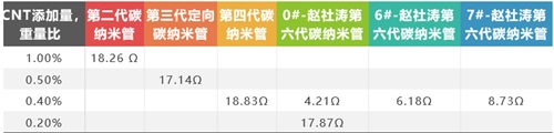 第六代碳納米管在鋰電池里與第二、三、四代碳納米管的極片電阻率對比測試數據