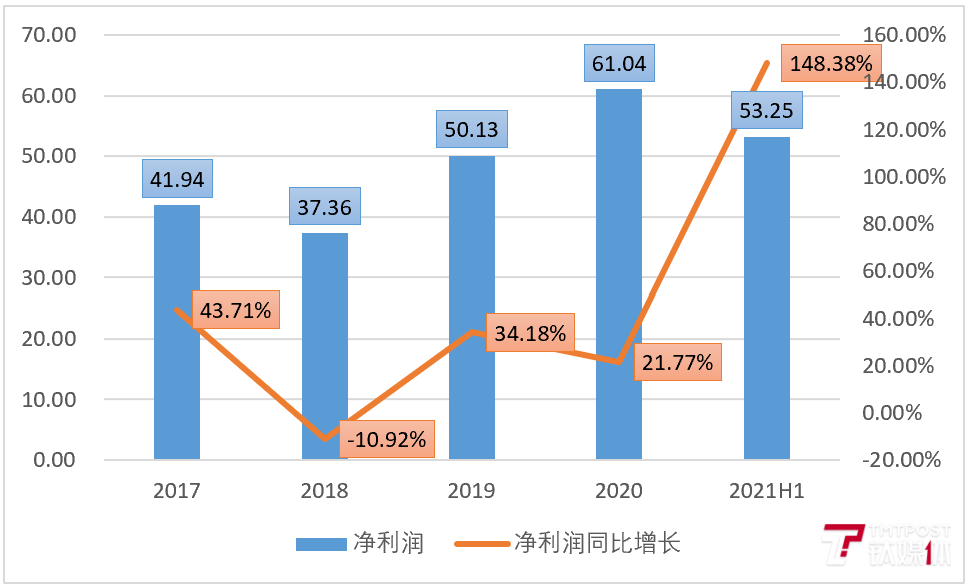 公司凈利潤從2017年的41.94億元增長至2020年61.04億元,2021年上半年凈利潤53.25億元,同比增長148.38%,環比增長34.47%,公司凈利潤同比增速超過營收同比增速,體現出公司在2021年上半年盈利能力有所增強。
