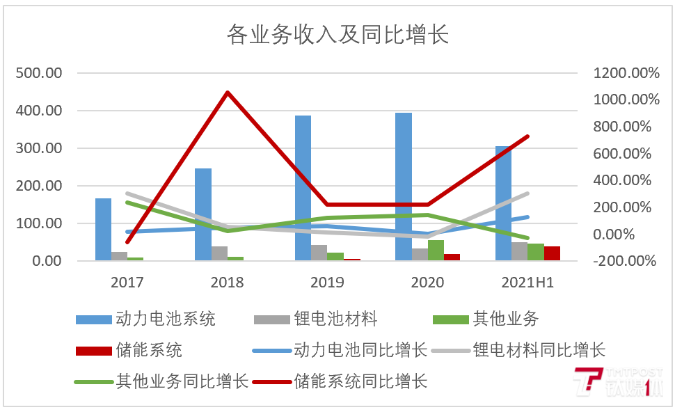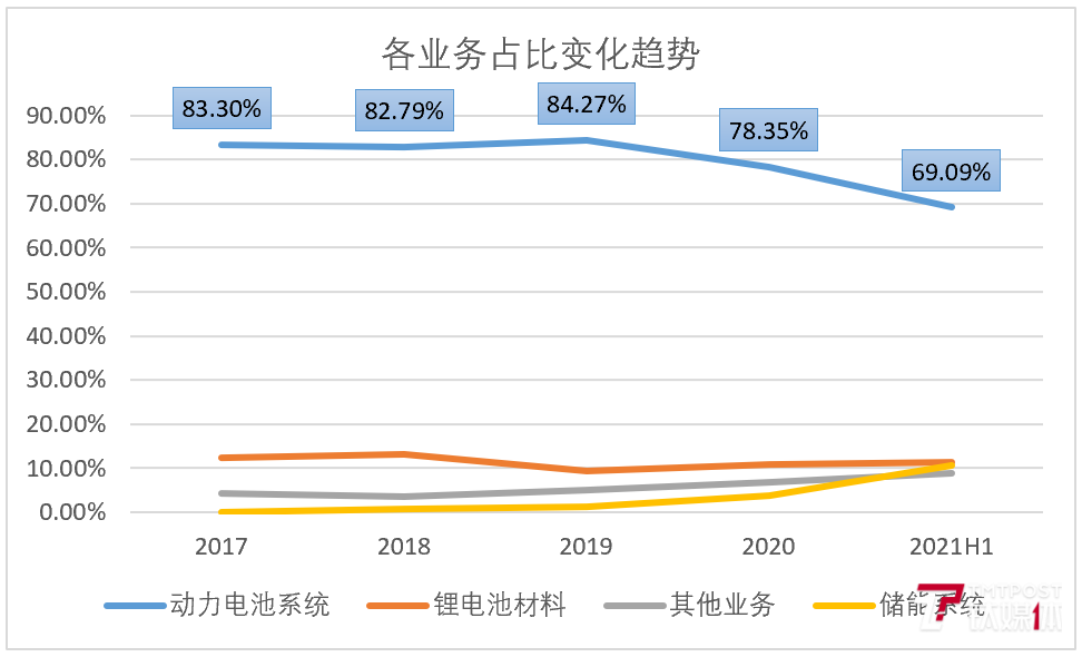 作為拉動營收增長主要的動力電池系統業務部分,雖然2021年上半年收入有較大幅度增長,但其對營收的貢獻比例下降至69.09%, 鋰電材料與儲能系統對營收貢獻率均超過10%。