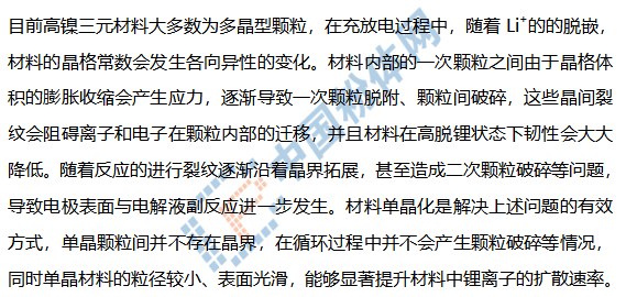 NCM三元材料雖然比容量較高,但存在循環性能差、倍率性能不佳等缺陷。造成這些缺陷的原因主要有:1)鋰離子擴散系數較小,極化較大,電導率差;2)鎳鋰混排。Ni2+與Li+離子半徑相似,容易在燒結過程中占據彼此的位置,造成充電過程中鋰層中的Ni2+被氧化為Ni3+和Ni4+,但放電過程中鎳離子無法脫嵌造成較大的不可逆容量;3)鎳的含量越高,材料的堿性越大,材料表面的碳酸鋰會造成材料在高溫下脹氣,過多的氫氧化鋰造成材料堿性過高,使材料在勻漿過程中形成果凍狀,無法涂布。針對這些缺陷,研究學者們通過元素摻雜、表面包覆、單晶化的方式對材料進行改性。