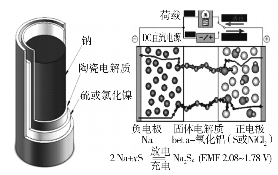 鈉硫電池的模型及工作原理如圖1所示。目前鈉硫電池結構主要設計為管式。電池由熔融電極和固體電解質組成,負極活性物質為熔融金屬鈉,正極活性物質為液態(tài)硫和多硫化鈉熔鹽,固體電解質兼隔膜為一種能夠傳導鈉離子的被稱為Beta氧化鋁的陶瓷材料,外殼則一般采用不銹鋼、鋁合金等金屬材料。