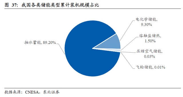 東北證券研究表示,當前,在我國各類儲能類型累計裝機規模中,抽水蓄能占比為89.20%;電化學儲能占比為9.30%;熔融鹽儲熱占比為1.50%;壓縮空氣儲能占比為0.03%;飛輪儲能占比為0.01%。