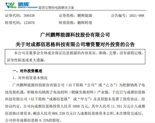 對此,鵬輝能源表示,本次使用自有資金對成都佰思格增資入股,能使公司更好的切入硬碳負極材料產業鏈,保障優質電池原材料的供應,有利于未來公司鈉離子電池產品的開發和大規模量產。