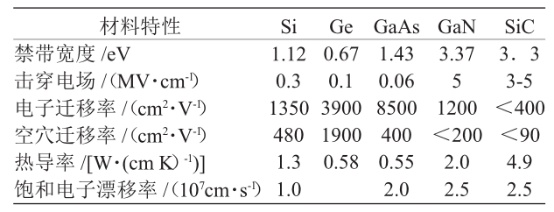 4H-SiC和6H-SiC帶隙約是Si的3倍,是GaAs的2倍;其擊穿電場強度高于Si一個數量級,飽和電子漂移速度是Si的2.5倍。4H-SiC的帶隙比6H-SiC更寬。下表為幾種半導體材料特性比較。