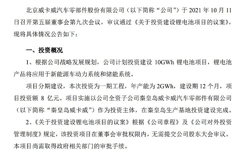10月12日,京威股份發布公告稱,公司計劃投資建設10GWh鋰電池項目,鋰電池產品將應用于新能源車動力系統和儲能系統。一期項目年產能為2GWh,投資額8億元,由全資子公司秦皇島威卡威汽車零部件有限公司作為投資主體,在秦皇島生產基地投資建設完成。