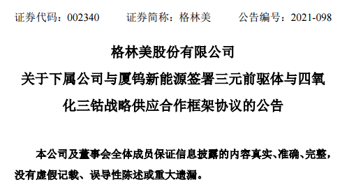 10月18日,格林美發布公告稱,公司全資子公司荊門格林美與廈門廈鎢新能源材料股份有限公司于近日簽署三元前驅體與四氧化三鈷戰略供應合作框架協議。