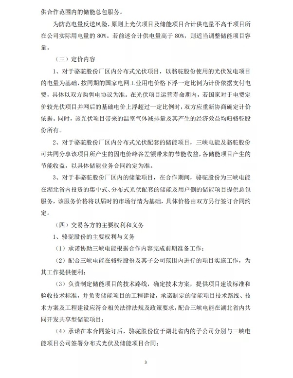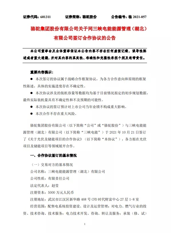 中國粉體網訊 10月22日,駱駝股份公布,公司與三峽電能能源管理(湖北)有限公司(“三峽電能”)于2021年10月21日簽訂了《關于光伏及儲能項目的合作協議》,各方擬在光伏項目及儲能項目等領域展開合作。