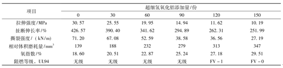 段金鳳等設計實驗天然膠100份;炭黑N22035份;氧化鋅6份;硬脂酸2份;硫磺2.4份;其他助劑3.2份,在試驗基本配方中加入不同添加量的超細氫氧化鋁,其余組份保持不變,硫化膠試樣的各項力學性能及阻燃性能的變化如下表: