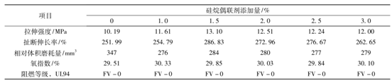 段金鳳等在上述試驗基本配方中加入150份經硅烷偶聯劑表面處理后的超細氫氧化鋁。硅烷偶聯劑添加量分別為超細氫氧化鋁質量的0、1%、1.5%、2%、2.5%、3%,其余組份保持不變,硫化膠的力學性能及阻燃性能變化如下表所示: