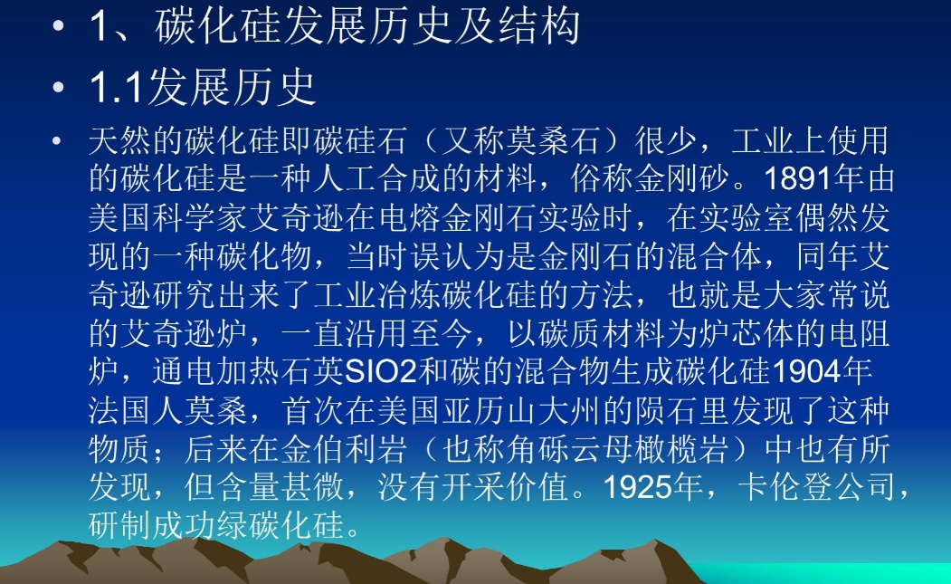 河南磨岳工業設計有限公司總經理毋水鑫先生給大家帶來了題為《碳化硅基礎常識及市場發展分析》的報告,毋總的報告分為四個部分,首先,毋總詳細的介紹了碳化硅發展歷史及結構特征,并分別分析了目前國內黑碳化硅和綠碳化硅的市場空間。