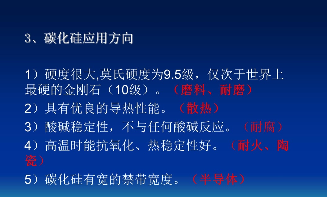 接下來,從毋總的報告中我們可以了解到,碳化硅具有以下特點及應用領域: