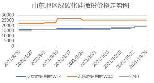 從報告中我們了解到,截止至發稿,山東地區綠碳化硅微粉系列的反應燒結用的W14、W10的主流價格在17000-19000元/噸,另外無壓燒結用的W0.5的主流價格在25500元/噸,F240的主流價格在18000-19500元/噸。山東、甘肅地區黑碳化硅細粉磨料用98 325目主流價格是11000-13000元/噸。山東地區重結晶碳化硅用Rs07主流價格在28000元/噸。