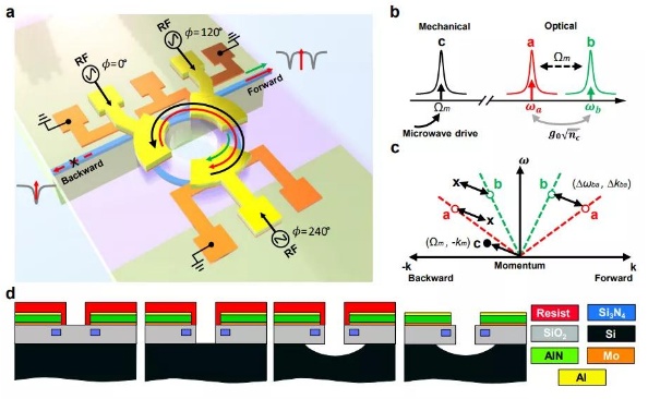 由于氮化硅缺乏電光效應,人們很難對氮化硅波導進行快速有效的調制,而高效率的調制是整個光隔離器得以實現的關鍵。去年,該團隊在利用激發聲波實現了對氮化硅光諧振腔的吉赫茲頻率的調制(該成果發表在 2020 年《自然-通訊》上),解決了這一問題;緊接著,他們將這個技術應用在集成光頻率梳的高速聲光調制(該成果發表在 2020 年《自然》上)。與去年的工作不同的是,此次團隊通過刻蝕底層的硅襯底,將聲波束縛在5微米厚的氧化硅薄膜上,從而極大提高了聲波的能量密度,從而將調制效率提高了 100 倍。這也有助于我們降低器件的功耗。