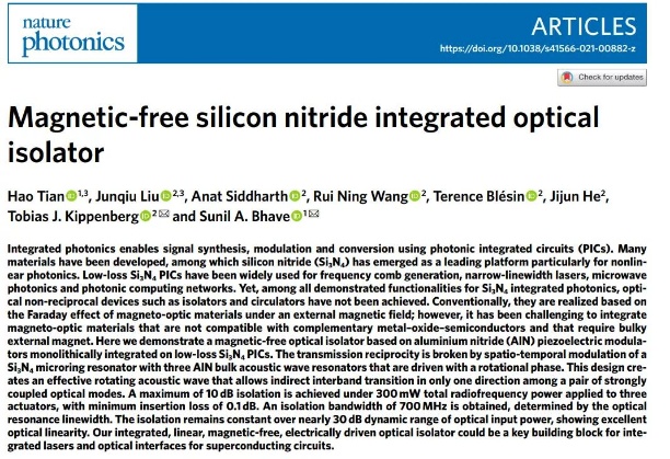 此項成果在 10 月 21 日以 Magnetic-FreeSilicon Nitride Integrated Optical Isolator 為題,發表在光學頂級期刊《自然-光子學》上,并同時在 MEMS 和光學領域獲得廣泛關注。美國普渡大學電子與計算機工程專業博士生田浩與瑞士洛桑聯邦理工學院(EPFL)劉駿秋博士為該篇文章的共同第一作者,洛桑聯邦理工學院教授 TobiasJ. Kippenberg 與普渡大學電子與計算機工程系教授 Sunil A. Bhave為共同通訊作者。此前,該項工作還在 2021 年的 IEEE MEMS 國際會議上獲得最佳學生論文的獎項,同時入選 2021 年國際光學會議 CLEO postdeadline 的會議報告。