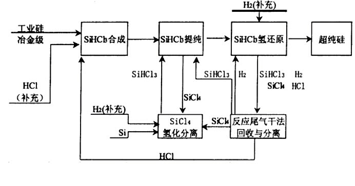 改良西門子法包括五個主要環(huán)節(jié):SiHCl3合成、SiHCl3精餾提純、SiHCl3的氫還原、尾氣的回收和SiCl4的氫化分離。該方法通過采用大型還原爐,降低了單位產(chǎn)品的能耗。通過采用SiCl4氫化和尾氣干法回收工藝,明顯降低了原輔材料的消耗。