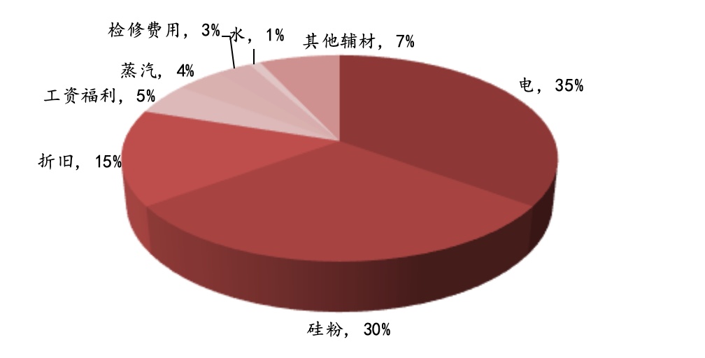 在當(dāng)前主流多晶硅生產(chǎn)法-改良西門子法的生產(chǎn)成本中,電力成本、原料成本和折舊成本是主要部分,三者合計占到總成本的80%左右,其中電力成本占比最大,占比35%;硅粉成本占比30%;折舊成本占比達15%。因而,電力、原材料、折舊成為降低多晶硅生產(chǎn)成本的主要領(lǐng)域。