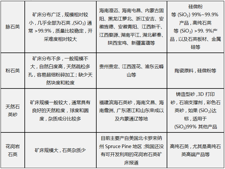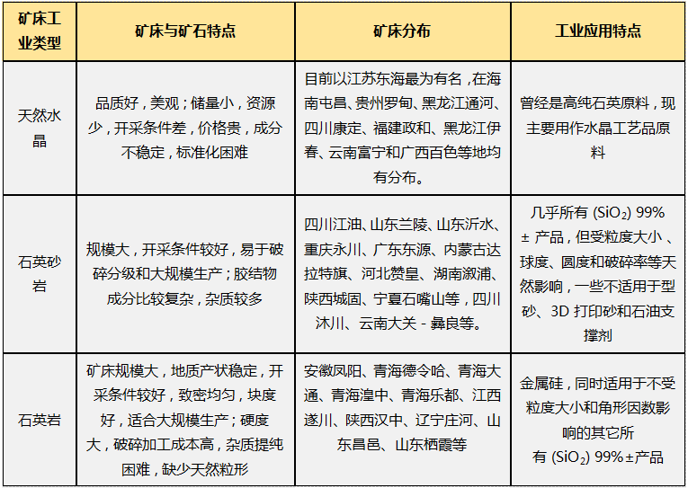 自然界石英礦床成因多種多樣,目前常見可供開發利用的石英礦床工業類型有天然水晶、石英砂巖、石英巖、脈石英、粉石英、天然石英砂和花崗巖石英七類。