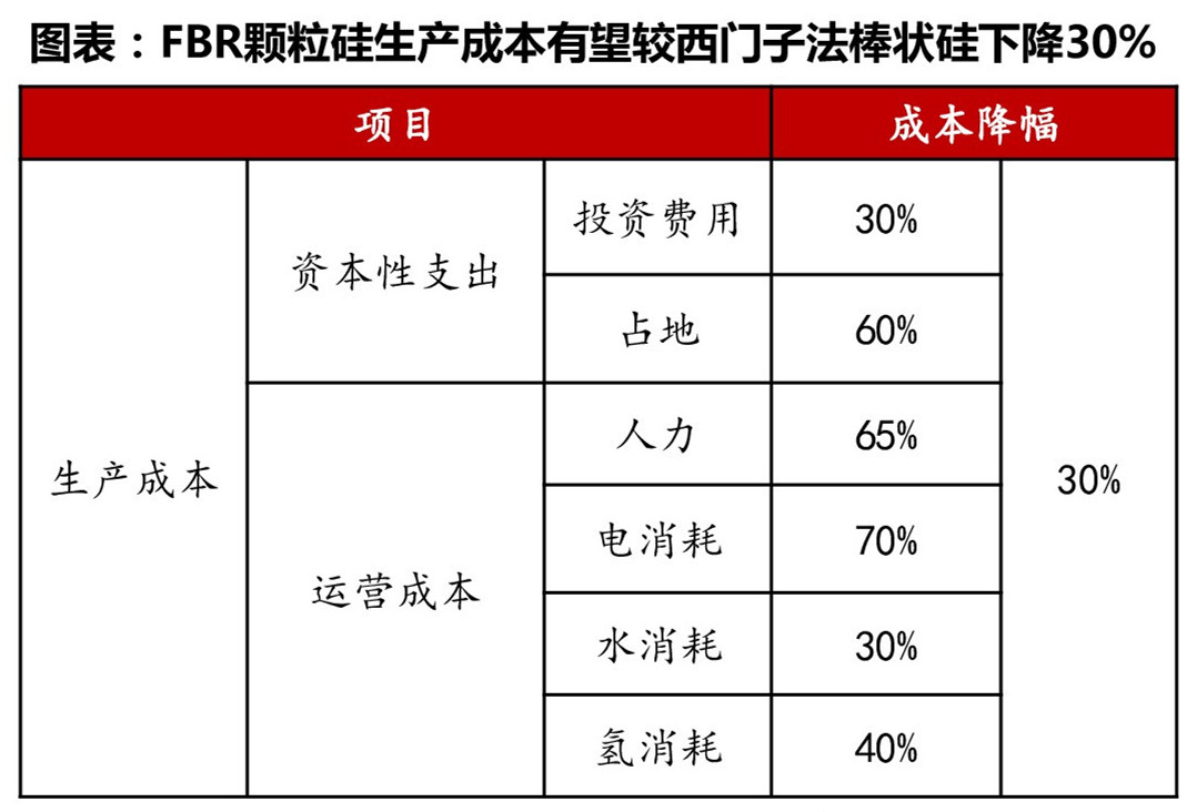 根據保利協鑫數據,顆粒硅生產成本有望較棒狀硅低30%,其中資本性支出中的新建工廠投資費用,FBR法較改良西門子法低30%,占地面積低60%;運營成本中的人員需求低65%,綜合電耗低70%,水消耗低30%,氫消耗低40%。顆粒硅生產過程中碳排放量更少,每萬噸顆粒硅可減少二氧化碳排放166萬噸。