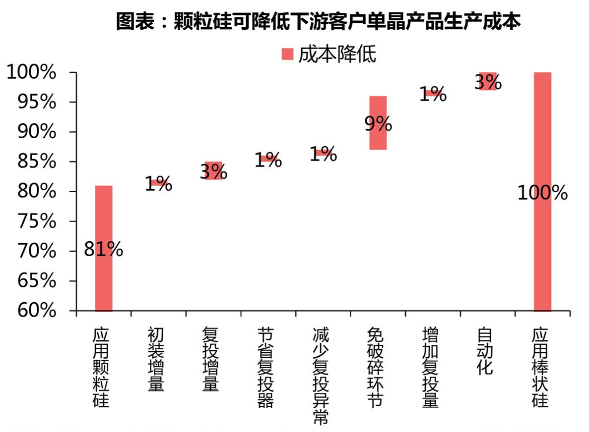 另外使用顆粒硅可降低下游客戶的單晶生產成本。根據保利協鑫數據,應用顆粒硅單晶成本是應用棒狀硅單晶硅成本的81%,在自動化/增加復投量/免破碎環節/減少復投異常/節省復投器/復投增量/初裝增量上可分別節省3%/1%/9%/1%/1%/3%/1%的成本。