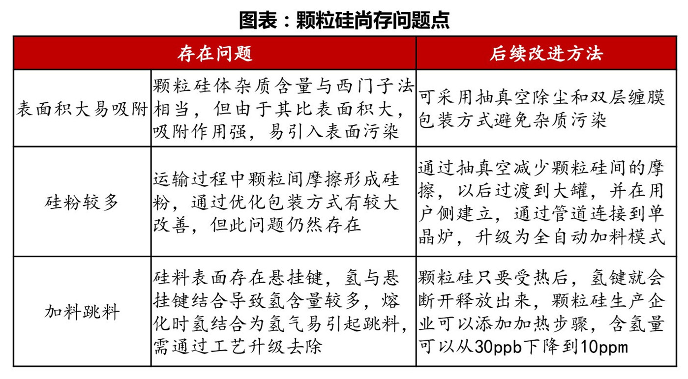 目前顆粒硅在使用過程中尚存問題,需要進一步的工藝改進。首先,顆粒硅表面積大于棒狀硅,更容易吸附產生表面污染;同時,顆粒硅在運輸過程中,容易相互摩擦形成硅粉,不利于后續投入生產;另外,顆粒硅表面存在氫鍵,熔化時產生氫氣易引起跳料。存在的問題尚需進一步工藝改善以解決,目前針對表面積大易吸附和硅粉較多的問題已有解決方案,而加料跳料的問題在小試設備上已得到解決,目前中試正在進行。