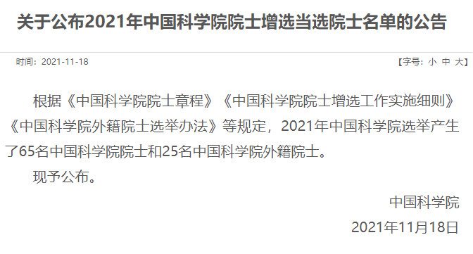 中國粉體網訊 2021年11月18日,根據《中國科學院院士章程》《中國科學院院士增選工作實施細則》《中國科學院外籍院士選舉辦法》等規定,2021年中國科學院選舉產生了65名中國科學院院士和25名中國科學院外籍院士。