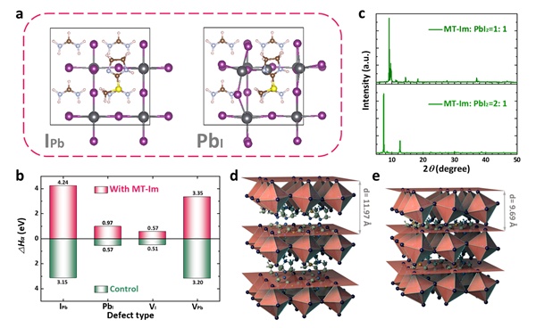 研究團(tuán)隊(duì)通過引入2-甲硫基-2-咪唑啉(MT-Im)陽離子,設(shè)計(jì)新型低維鈣鈦礦材料并引入鈣鈦礦吸光層和空穴傳輸層界面。由于MT-Im陽離子既可以作為電子受體,又可以作為電子給體,能夠?qū)缑娑嘣缘你U(Pb)基缺陷進(jìn)行定向管理。其中-C=N和-S-CH3基團(tuán)表現(xiàn)出路易斯酸性,與未配位的Pb2+形成Pb-N和Pb-S配位鍵,抑制Pb0的產(chǎn)生;NH2+基團(tuán)又可以與PbI3-(Pb-I反位缺陷)形成配位鍵,錨定Pb2+離子。通過密度泛函理論(DFT)計(jì)算可知(圖1a,b),含有MT-Im的鈣鈦礦界面處PbI和IPb缺陷形成能分別由0.57 eV和3.15 eV升高至0.97 eV和4.24 eV,可以有效抑制缺陷的產(chǎn)生。同時(shí),研究發(fā)現(xiàn),當(dāng)調(diào)節(jié)MT-Im陽離子的濃度時(shí),界面處低維鈣鈦礦呈現(xiàn)出混合晶相(圖1c-e),有利于提高對(duì)于不同類型界面缺陷的鈍化效果,實(shí)現(xiàn)穩(wěn)定鈣鈦礦界面的作用。