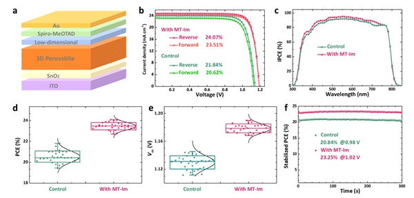圖2. (a) 基于低維鈣鈦礦界面修飾的鈣鈦礦太陽電池結(jié)構(gòu)示意圖; (b-f) 器件光伏性能測試結(jié)果。