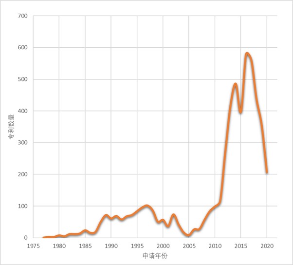 基于專利的技術(shù)趨勢分析通常遵循四個(gè)連續(xù)的階段:i)前期(新興),ii)起飛(成長),iii)加速(成熟),最后 iv)穩(wěn)定(飽和)。開發(fā)前階段的特點(diǎn)是年度專利數(shù)量呈指數(shù)增長,而成長階段的特點(diǎn)是專利數(shù)量下降,因?yàn)楣疽呀?jīng)在對技術(shù)進(jìn)行整合和商業(yè)化。