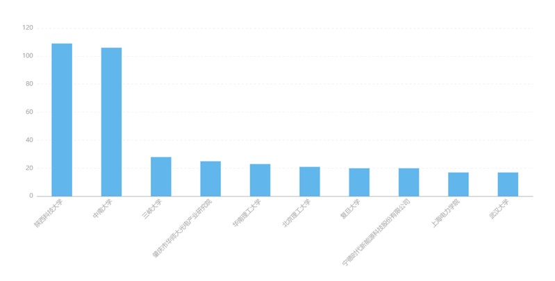 由圖4可以看出,專利申請的前十名除了寧德時(shí)代一家公司外,其余均為高;蚩茖W(xué)研究院所。陜西科技大學(xué)和中南大學(xué)掌握最多的鈉離子電池專利。這反映出目前鈉離子技術(shù)的發(fā)展程度還不夠成熟,離大規(guī)模市場應(yīng)用還有一定的距離。