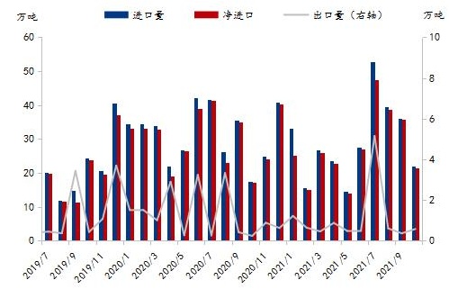 據海關總署數據顯示,2021年10月中國氧化鋁進口量為21.94萬噸,環比下降39.28%,同比增長25.97%;氧化鋁出口量為0.57萬噸,環比增加60.08%,同比增加147.52%;氧化鋁凈進口量為21.37萬噸,環比下降40.27%,同比增長24.34%。另外,2021年1-10月中國氧化鋁進口量累計達到291.31萬噸,同比下降2.04%;氧化鋁出口量累計達到10.81萬噸,同比下降24.80%;氧化鋁凈進口量累計達到277.41萬噸,同比下降1.98%。
