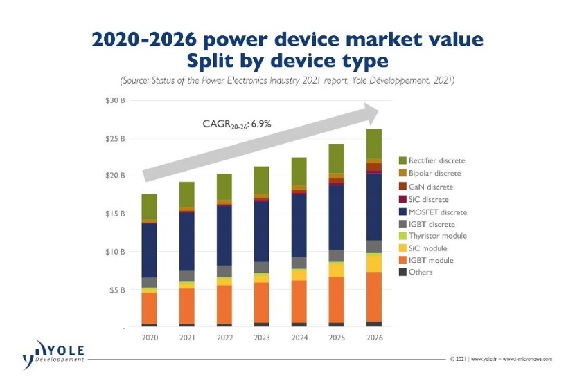 中國粉體網訊 近日,Yole Développement (Yole) 發表了關于功率模塊封裝市場的分析。Yole功率半導體活動團隊首席分析師 Ana Villamor 博士在文中表示,隨著全球制定“碳達峰、碳中和”目標,帶來更多綠色能源發電、綠色汽車、充電樁、儲能等需求,功率半導體器件市場將從2020年的175億美元,增長至2026年的260億美元,年均復合增長率達6.9%。