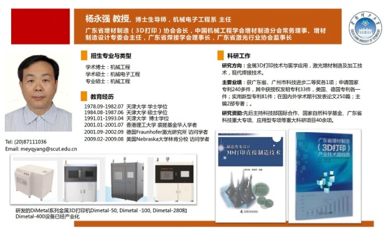 楊永強教授在增材制造(3D打印)、激光材料加工、焊接裝備與工藝等方面做了大量的研究工作,成功研制出國內第一臺激光選區熔化(SLM)快速成型機,實現了金屬零件的直接快速成型制造,并將數字化、網絡化、個性化、定制化為特點的金屬3D打印技術應用在醫學領域中。