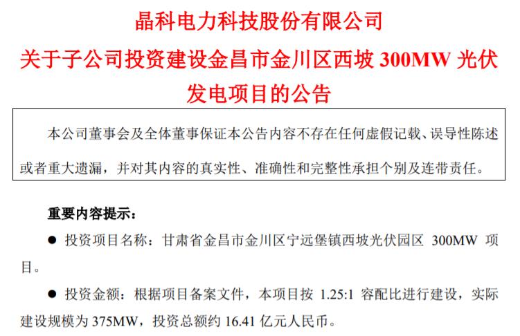 中國粉體網訊 12月8日,晶科科技發布公告,公司全資下屬公司金昌晶科擬投建甘肅省金昌市金川區西坡300MW光伏發電項目,實際建設規模為375MW,投資總額約16.41億元。本項目擬拆分為兩個150MW(實際建設規模為187.50MW)的子項目,并由金昌晶科的全資子公司金昌市晶亮電力有限公司和金昌市晶陽電力有限公司各自承建和運營。