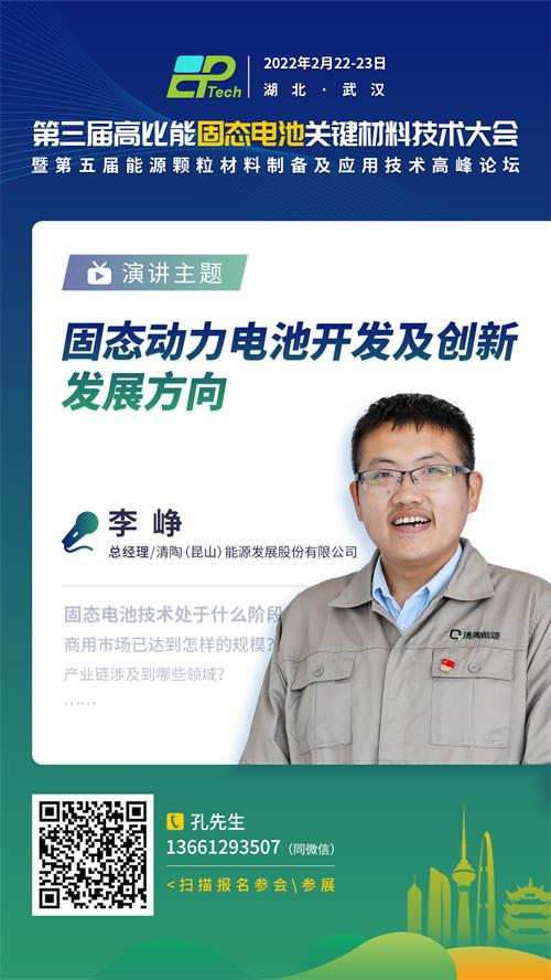 為促進行業交流,2022年2月22-23日,由中國粉體網主辦的“第三屆高比能固態電池關鍵材料技術大會”將于湖北武漢東方建國大酒店舉辦,屆時將邀請來自清陶(昆山)能源發展股份有限公司的李崢總經理作《固態動力電池開發及創新發展方向》報告。報告基于主講人清陶多年固態電池開發經驗和近年來與各新能源汽車整車企業進行產品方案設計和測試的經驗。針對動力電池用戶需求,主講人將介紹固態電池在新能源汽車領域應用的研發思路和開發方向;并從材料+裝備+工藝的多維度角度入手,介紹清陶在固態動力電池領域的產品開發進展。