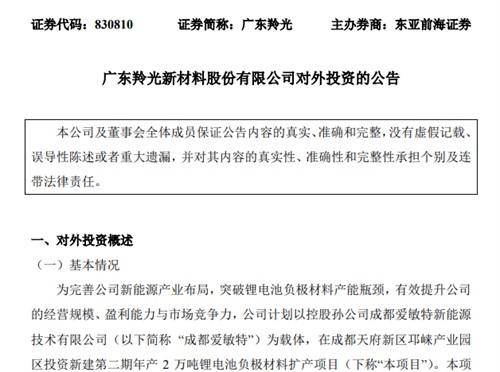 12月15日,廣東羚光發布公告,為完善公司新能源產業布局,突破鋰電池負極材料產能瓶頸,有效提升公司的經營規模、盈利能力與市場競爭力,公司計劃以控股孫公司成都愛敏特新能源技術有限公司為載體,在成都天府新區邛崍產業園區投資新建第二期年產2萬噸鋰電池負極材料擴產項目。