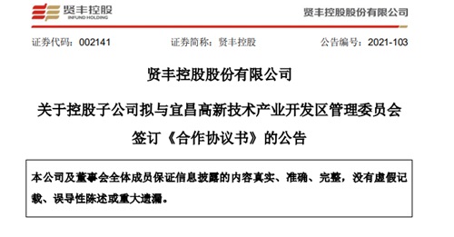 近日,賢豐控股發布公告稱,公司控股子公司賢豐新材料(深圳)有限公司(“賢豐新材料”)擬在宜昌高新技術產業開發區管理委員會所轄白洋工業園投資建設賢豐新材料三元前驅體項目,賢豐新材料與宜昌高新管委會擬就相關事宜簽訂合作協議。公告顯示,項目總投資約15億元,規劃建設具備5萬噸三元高鎳前驅體項目及配套工程。