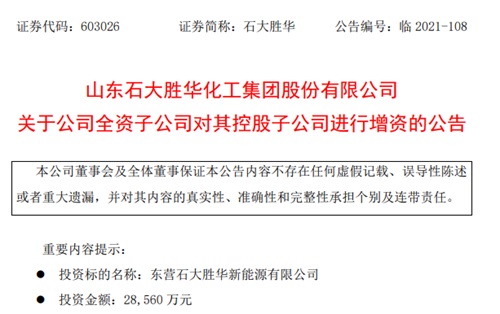 12月11日,石大勝華發布公告,擬2.86億元增資勝華新能源,加快液態鋰鹽項目建設。勝華新能源系石大勝華全資子公司勝華新能源科技(東營)持股51%的控股子公司。今年11月,勝華新能源擬投資5.6億元建設10萬噸/年液態鋰鹽項目,建設周期15個月,預計2023年2月建成投產。 伴隨新能源市場快速崛起,除液態鋰鹽外,石大勝華還不斷下探產業鏈,布局電解液、鋰電材料等業務,進軍新能源領域。據統計,今年以來,其已投資超50億元,不斷向新能源領域發力。