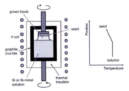 液相法生長碳化硅單晶最早是由德國人于1999年提出的。近年以來,日本的一些單位又對于液相法生長碳化硅進行了大量的研究改進。下圖是碳化硅液相生長裝置及溫度梯度示意圖。采用射頻感應線圈對反應容器進行加熱,選用石墨材料作為坩堝,同時將其作為碳源,在石墨坩堝中填充硅熔體。將碳化硅晶種放置在石墨坩堝頂部,剛好與熔體接觸,控制晶種溫度略低于熔體溫度。利用溫度梯度作為生長驅動力來實現晶體的生長。生長一般在惰性氣體氣氛(如Ar)中進行,生長溫度在1750~2100℃之間。為了提高晶體的生長速率,在生長過程中可以調節石墨坩堝和種子晶體的旋轉方向和旋轉速度。