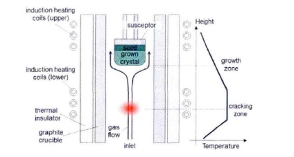 高溫化學氣相沉積法(HTCVD)由瑞典Okmetric公司于20世紀90年代提出,并用于生長碳化硅單晶。下圖為碳化硅單晶高溫化學氣相沉積生長裝置原理圖。在此方法中,碳化硅單晶在一個垂直形態的石墨坩堝中進行生長,H2或He作為載氣,SiH4、C2H4或C3H8分別作為Si源和C源。在反應腔室高溫區,源氣體發生分解并相互作用生成SiC。該方法設備費用昂貴,生長成本較高,限制了其推廣應用。